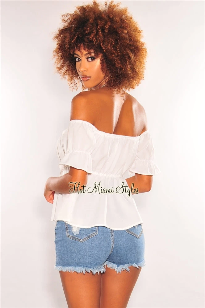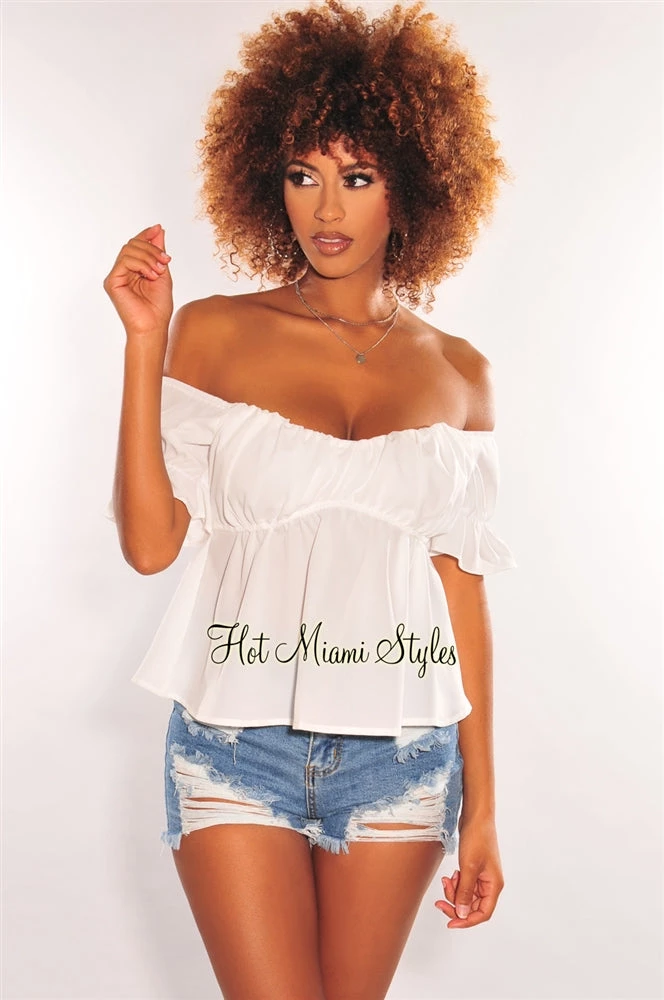Deliver major chic vibes in our white off shoulder crop top. Featuring a babydoll silhouette on a short sleeves top with ruffle details.