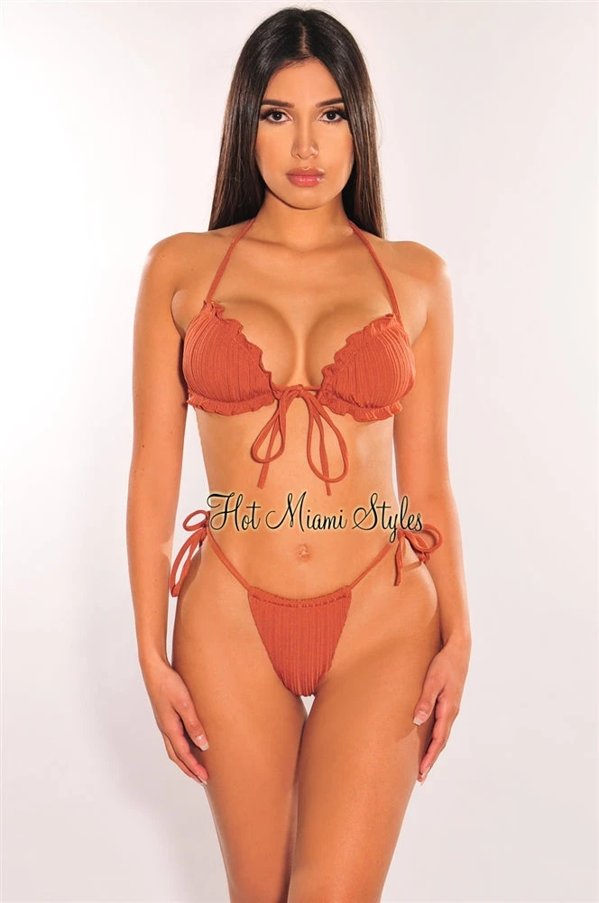 Add a little sweetness to your swimwear collection with this gorgeous latte color bikini. Featuring an adjustable padded bandeau top with double strap tie up at back and matching bottoms to complete the look.