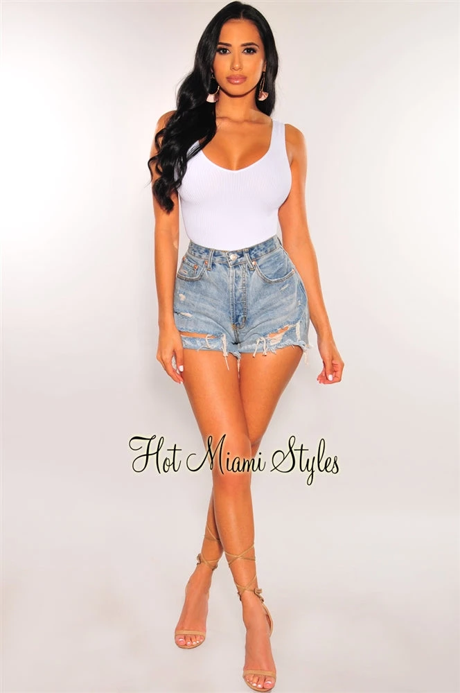 Level up your shorts wardrobe with these light denim ripped shorts. Designed with ripped details and a frayed hem, featuring a button up closure and a high waist fit.