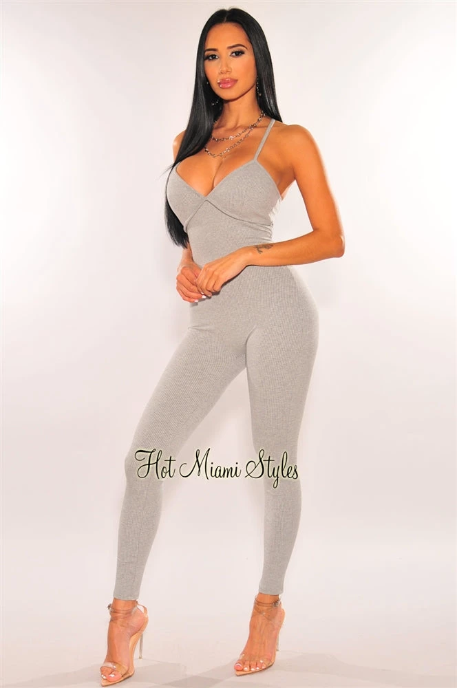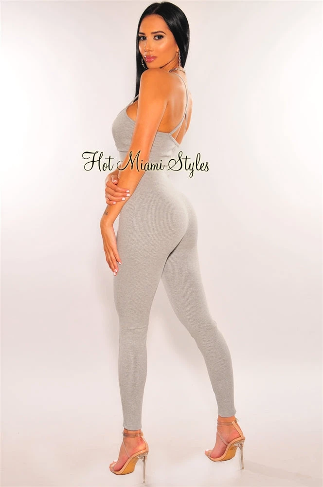 Vendor-unknown Light Gray Ribbed Faux Bustier CrissCross Back Jumpsuit Just In