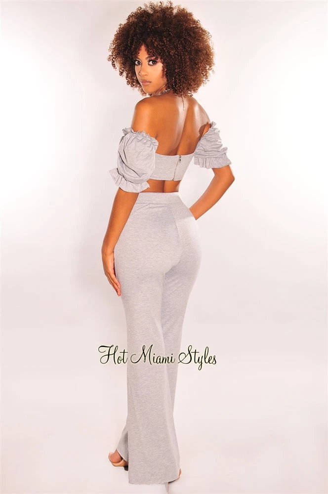This light gray short sleeve two piece set is all the outfit goals! Featuring a bustier underiew crop top with matching high waist palazzo pants to complete the look.