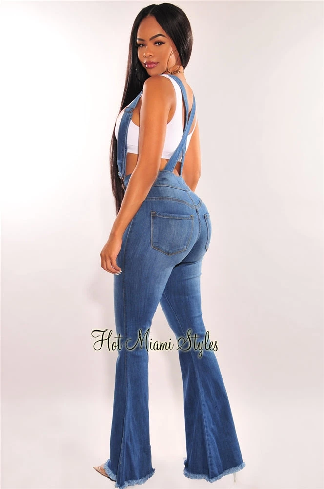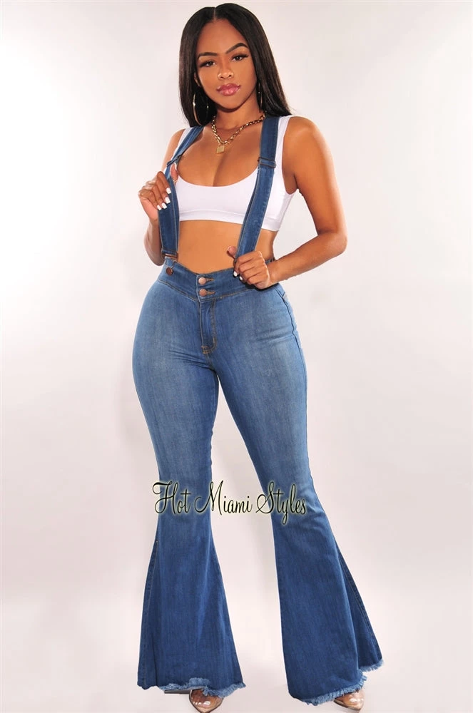 Upscale a classic look in our fashionable overall jeans. Featuring crisscross back suspenders that attach to the perfect fit high waist bell bottom jeans.