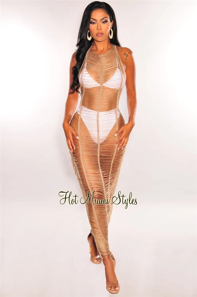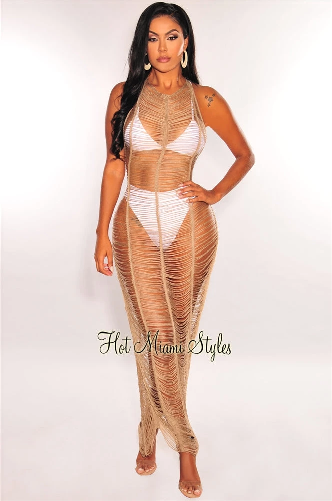 This crochet cover up is everything we are currently loving with a super in style ladder cut. Designed with a halter tie up and an open back with snatch belted detail at waist. Pair with your favorite HMS swimwear.