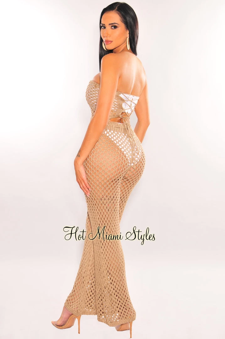We are loving this new summer must have! Made with a crochet bodice on a strapless jumpsuit design featuring a lace up back and a drawstring belt for a perfect fit on a palazzo style design.