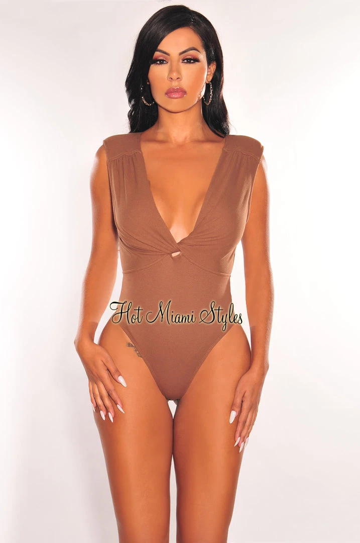 Vendor-unknown Mocha Ribbed Sleeveless V Neck Knotted Open Back Bodysuit Just In