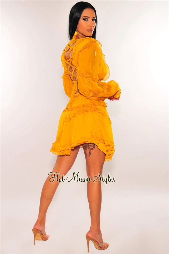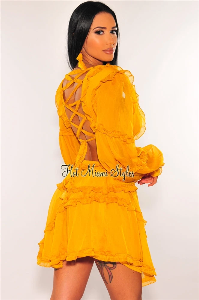 Staycay or vacay? This mustard dress is everything you need. Features a v neckline with a sexy cut out detail, a lace up open back and long sleeves.