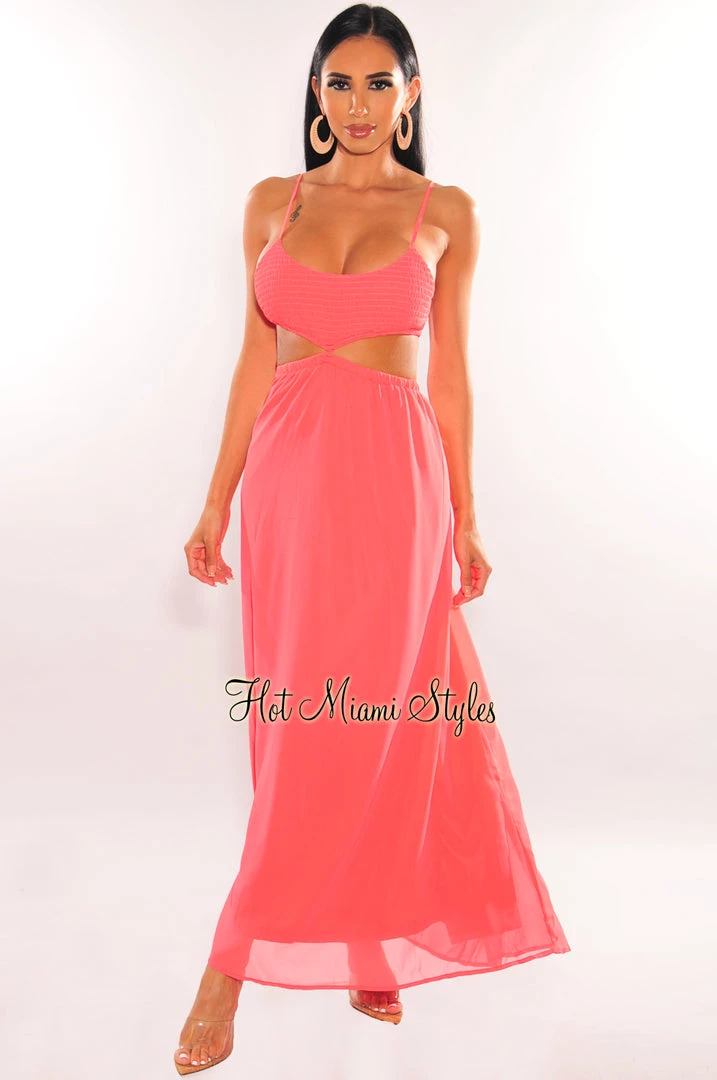 Show off some skin in this romantic cut out maxi dress. Features a chic smocked bodice at top with adjustable spaghetti straps, attached to a maxi skirt giving a cut out at waist with an open back and an appealing maxi silhouette.