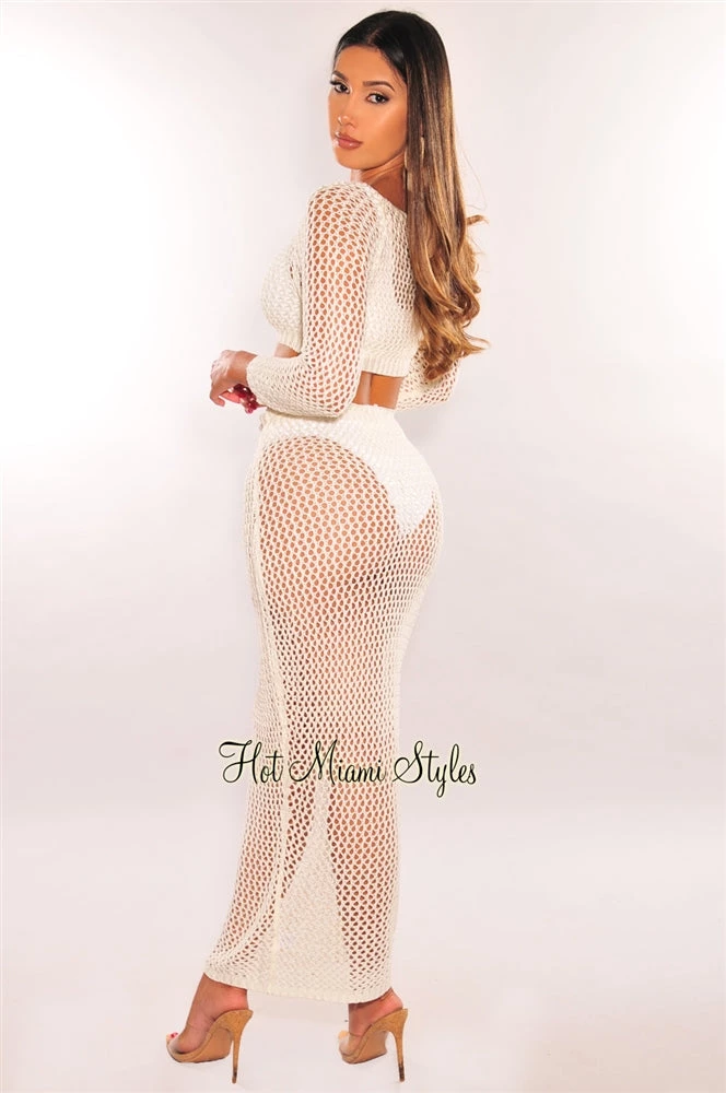 Be on trend this season in this crochet cover up set. Designed with a long sleeve crop top and chic matching skirt perfect to show off your favorite HMS bikini.