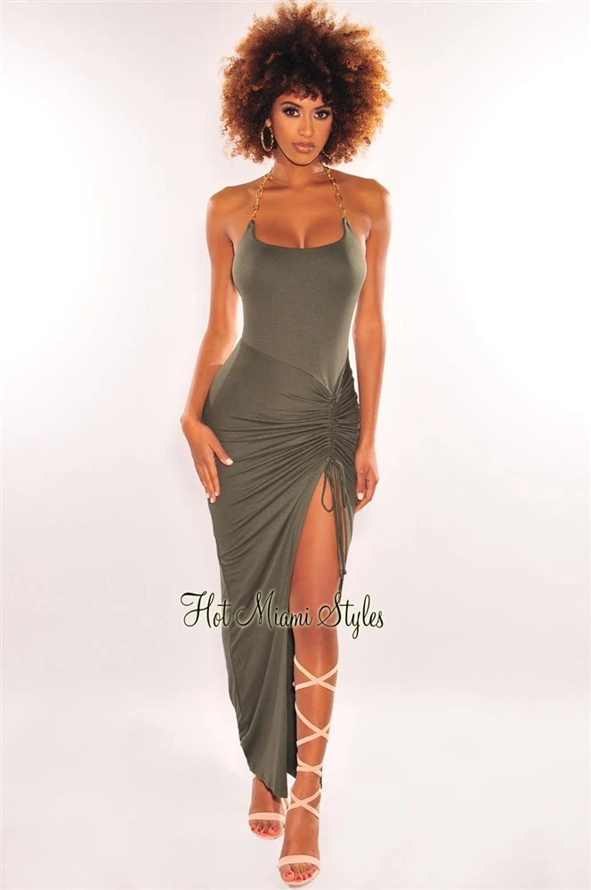 Vendor-unknown Olive Gold Chain Halter Ruched Slit Maxi Dress Just In