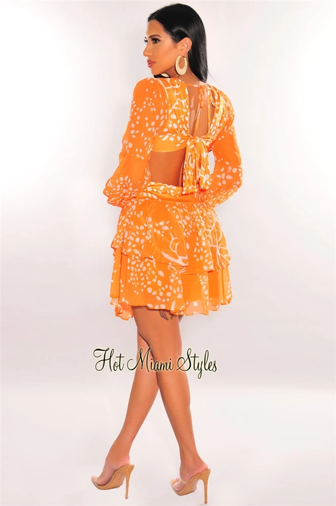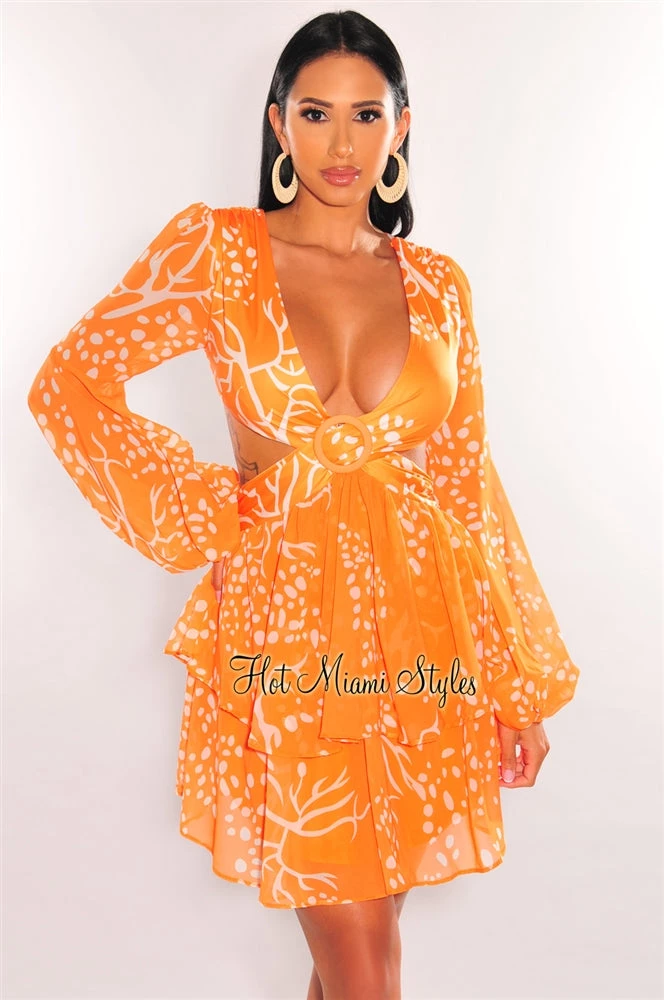 Feel like a total paradise in this flirty dress. Features a sexy v neck with an O-Ring detail on a cut out dress design and long sheer sleeves on a fun print.