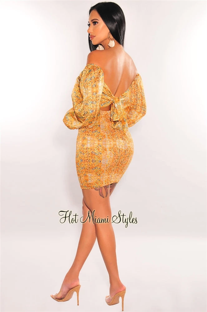 Find the perfect summer look in this orange print mini dress. Made with an off shoulder tie up at back design, featuring a smocked bodice to hug your curves.