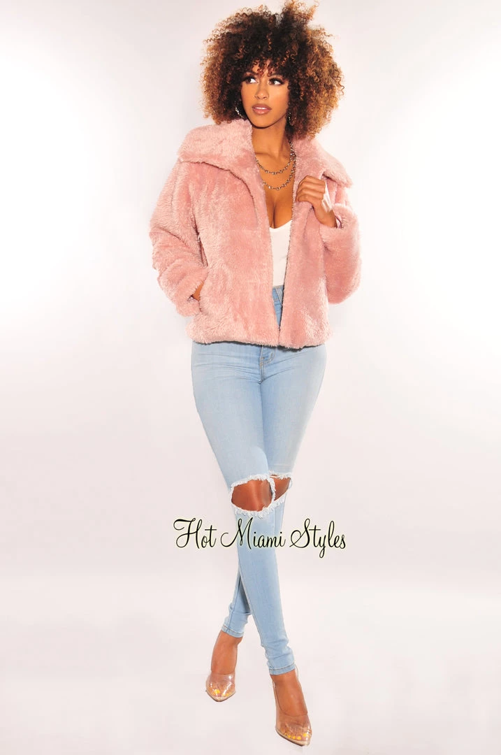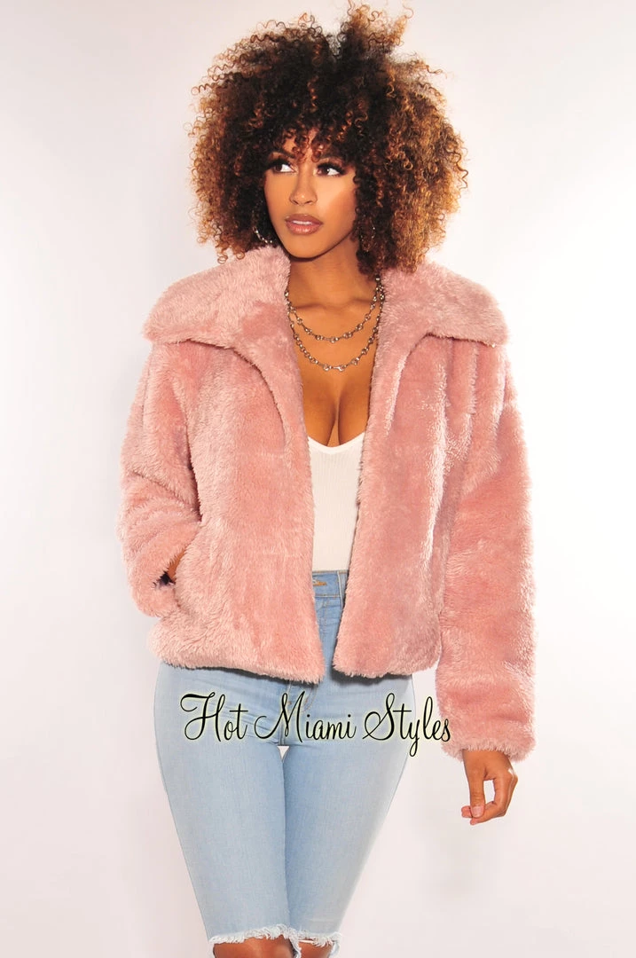 The perfect pink fuzzy jacket for your favorite seasonal looks has arrived! Featuring a collared long sleeve design for the perfect add on to your fit.