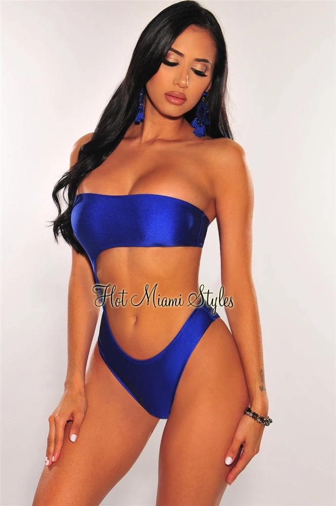 Stand out on the shore with this royal blue strapless swimsuit. Featuring a sexy side cut out with a gorgeous shimmery and stretchy body shaping bodice.