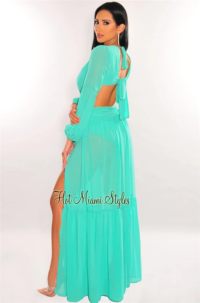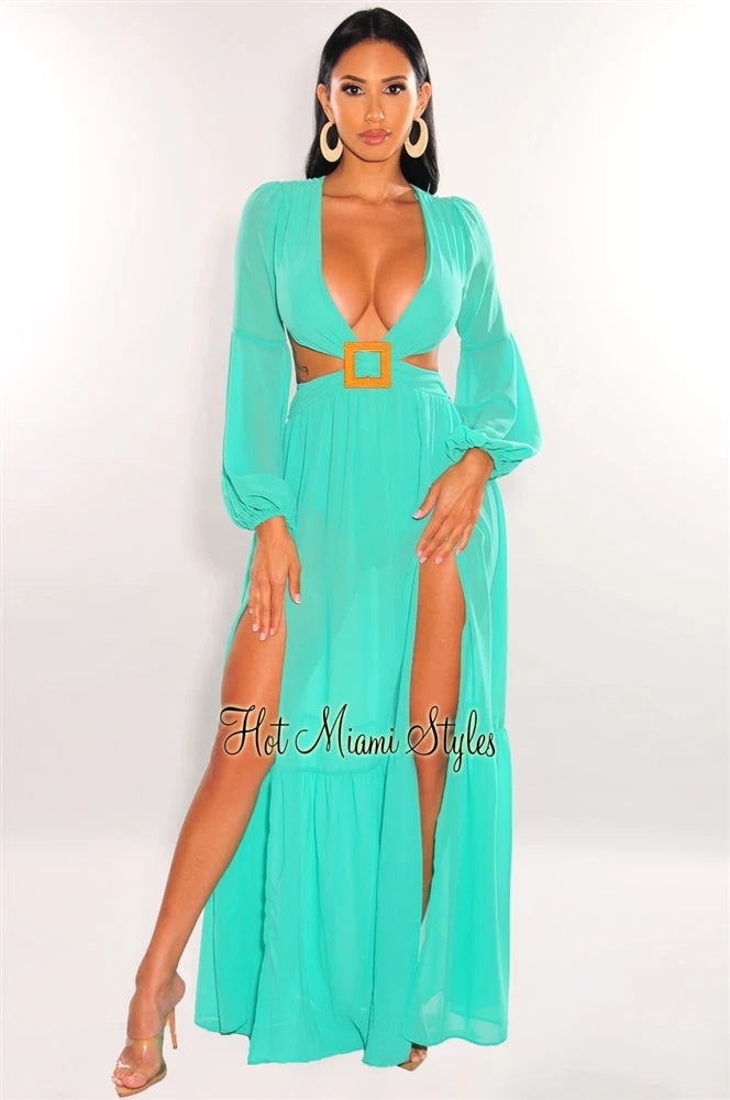 Vendor-unknown Teal Mesh V Neck Cut Out Long Sleeves Double Slit Maxi Dress