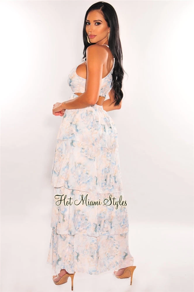 Feel all the good vibes this summer in this must have! Featuring spaghetti straps on a V neck and a sexy cut out detail on a beautiful layered maxi dress silhouette.