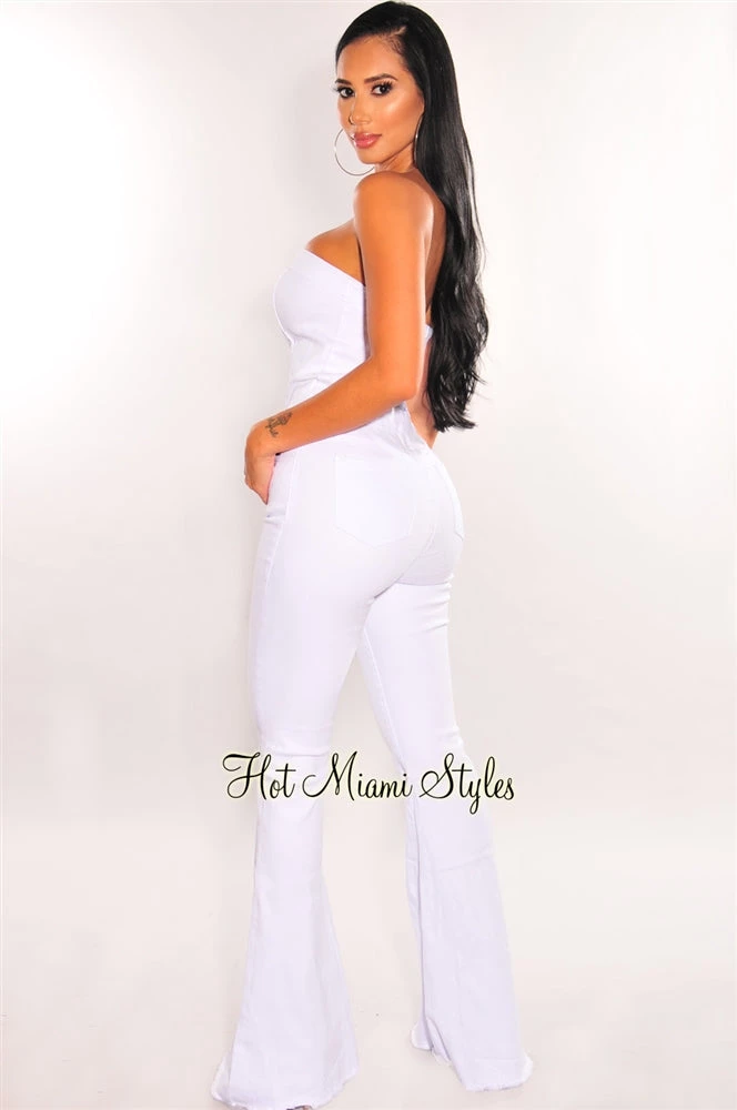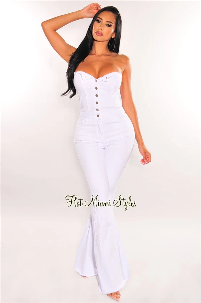 Add some edgy vibes to your weekend wardrobe with this jumpsuit. Made with white denim, adjustable silver buttons and bell bottom leg fit. We are obsessed with this show-stopping look.