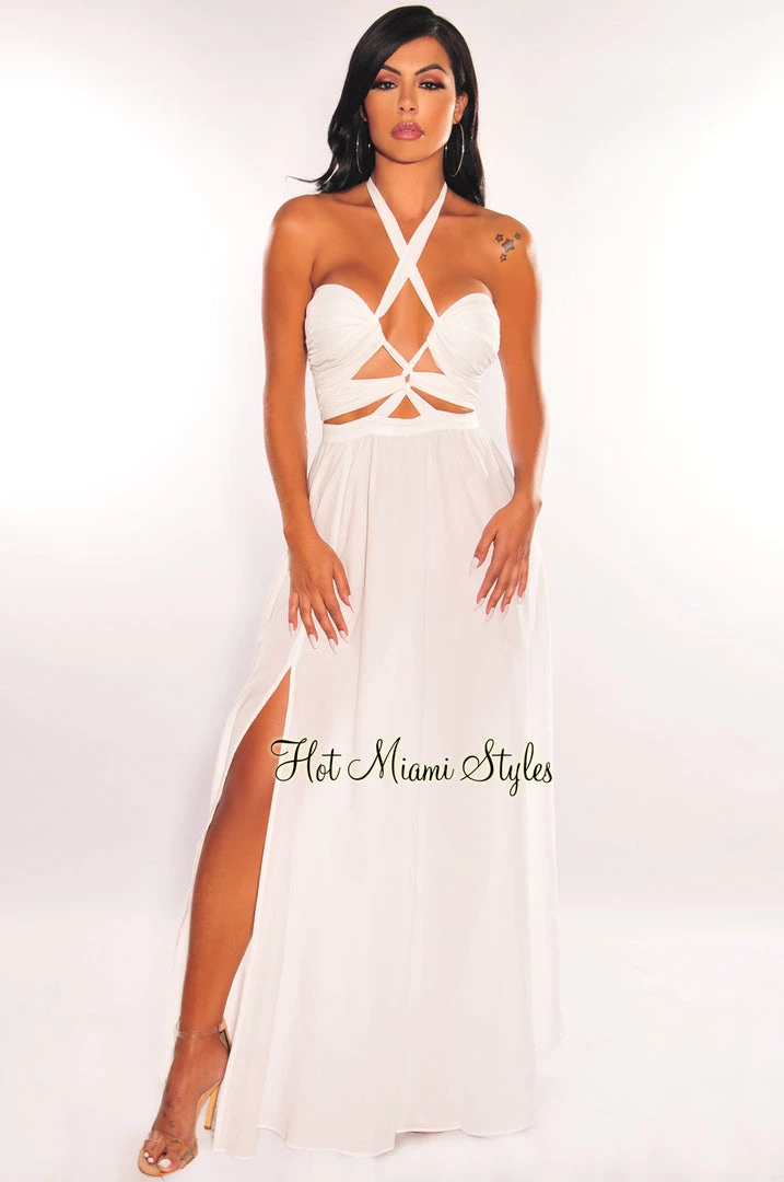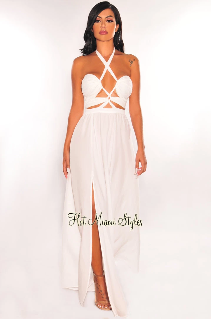 Leave them speechless in this beautiful maxi dress. Designed with a halter neckline, sultry cut out detail and a sexy thigh high slit.