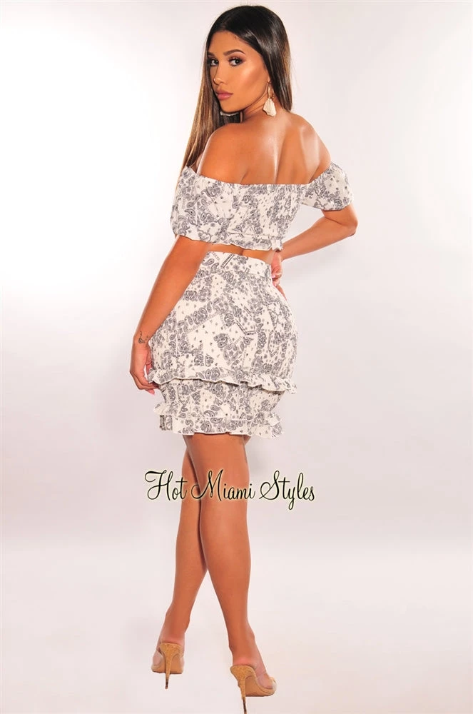 Deliver cute chic vibes in this paisley print set when you slip into this skirt two piece set. Made of a smocked bodice which fits like second skin and shows off your curves. Features an off the shoulder drop top with matching belted high waist skirt.