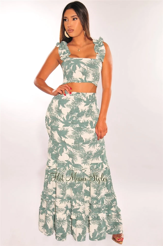 Babe, this outfit is perfect for that summer get away! This gorgeous palm print two piece set features a smocked crop top with beautiful ruffle straps and a matching high waist ruffle maxi skirt.