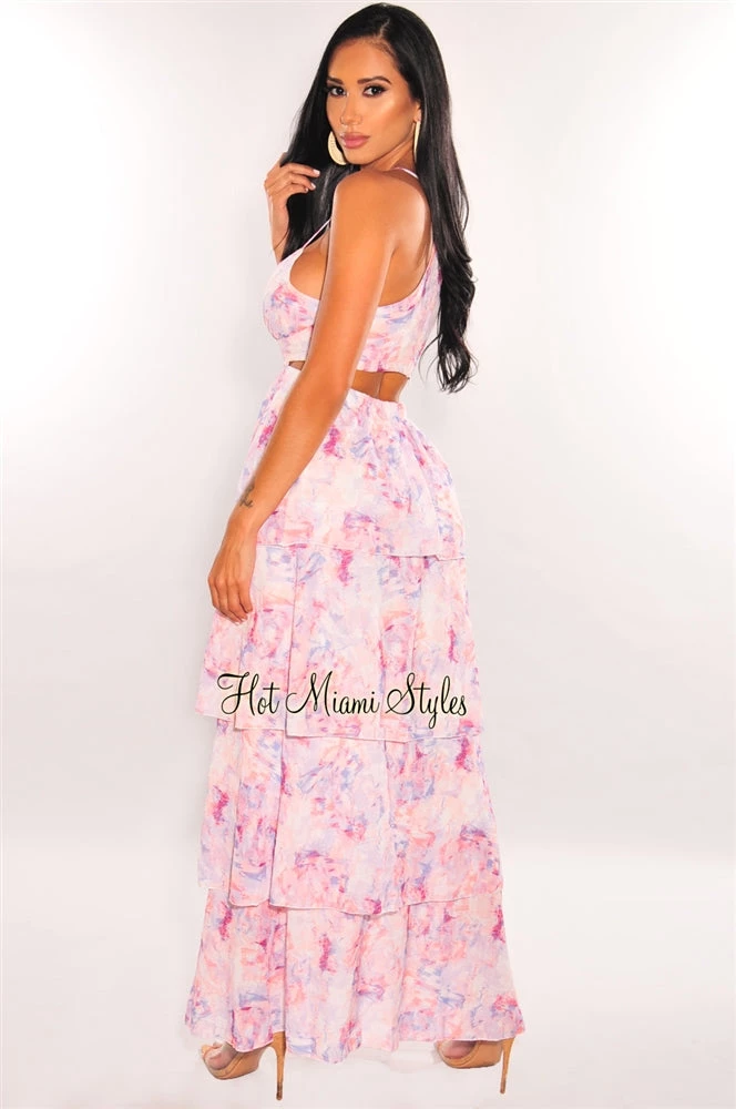 Feel all the good vibes this summer in this must have! Featuring spaghetti straps on a V neck and a sexy cut out detail on a beautiful layered maxi dress silhouette.