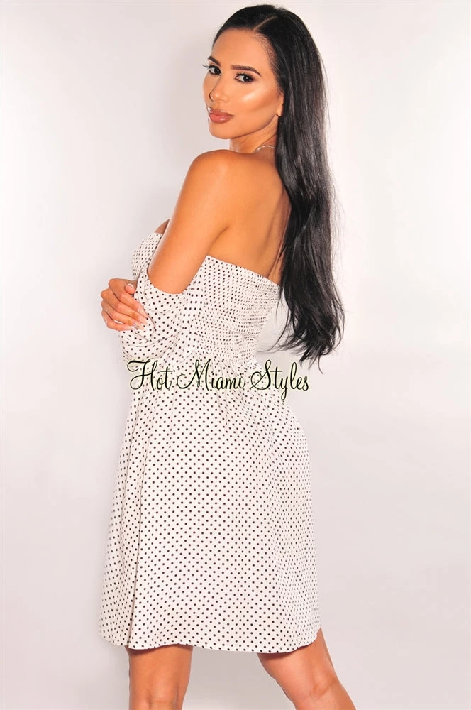 Find the perfect cute yet sexy look in this white polka dot mini dress. Made with an off shoulder flowy short sleeve design, a smocked bust and a sweet flowy dress length.