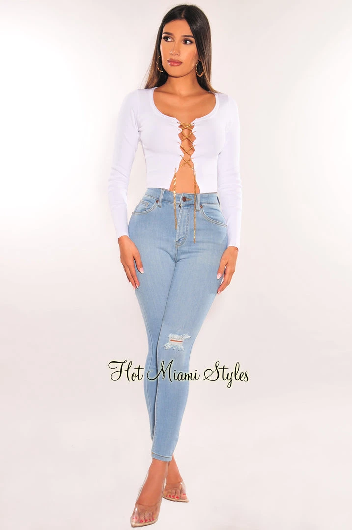 Deliver edgy chic style vibes with this black crop top. Featuring a ribbed bodice, long sleeveless and a lace up front with a stylish gold chain to complete the look.