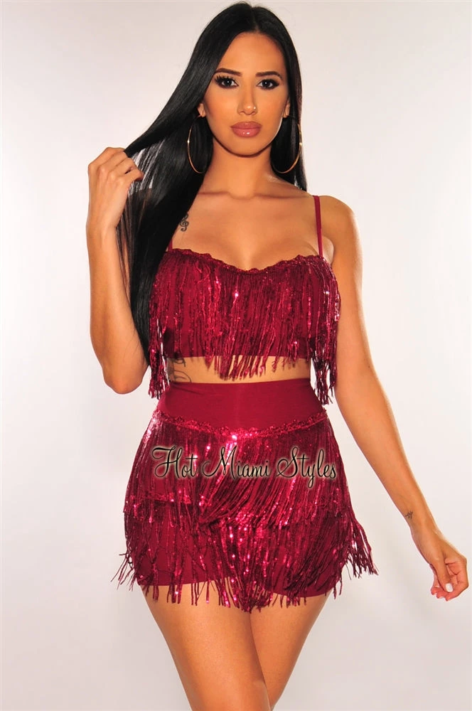 Shine on them anywhere you go in this wine two piece set. Featuring gorgeous flowing sequins, a bustier style top and chic matching shorts.
