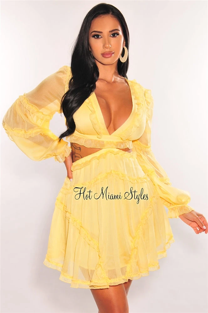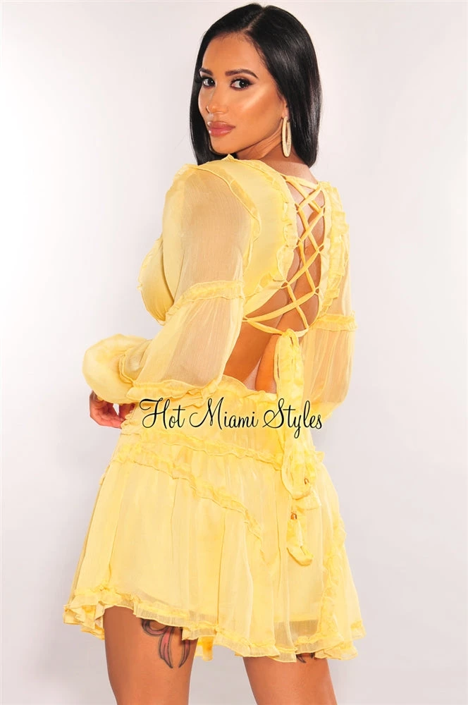 This gorgeous dress is everything you need for that special event. Features a v neckline with a sexy cut out detail, a lace up open back and long sleeves.