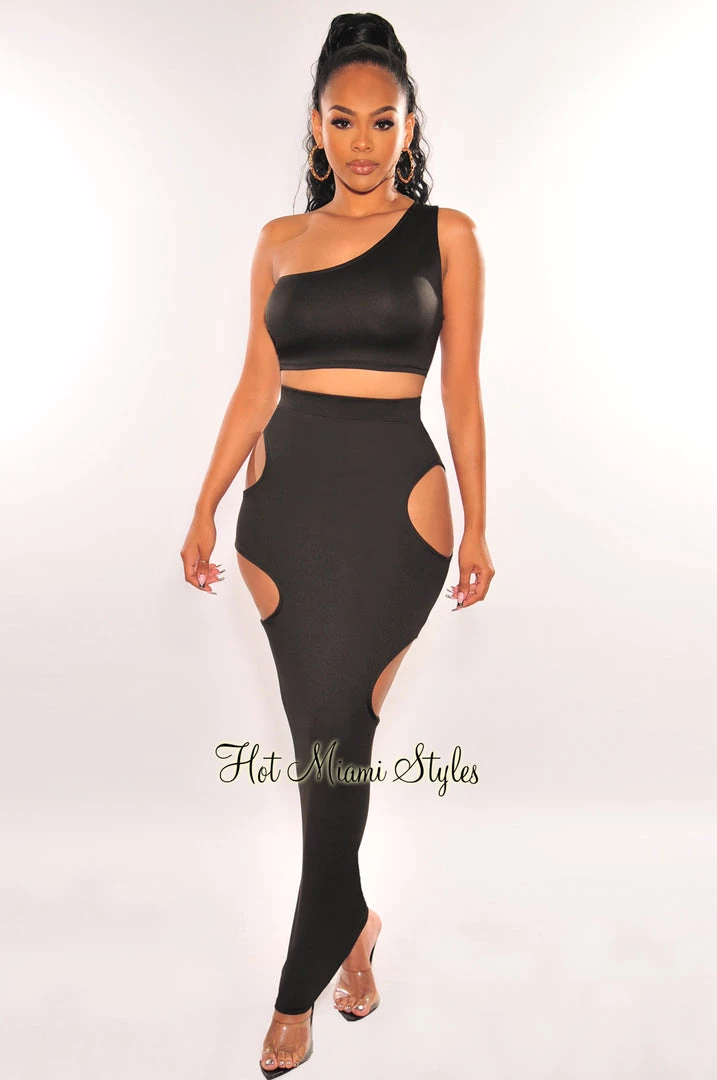 It’s a vibe in this black two piece set. Featuring a one shoulder neckline with an ultra stretchy curve hugging matching sultry cut out skirt.