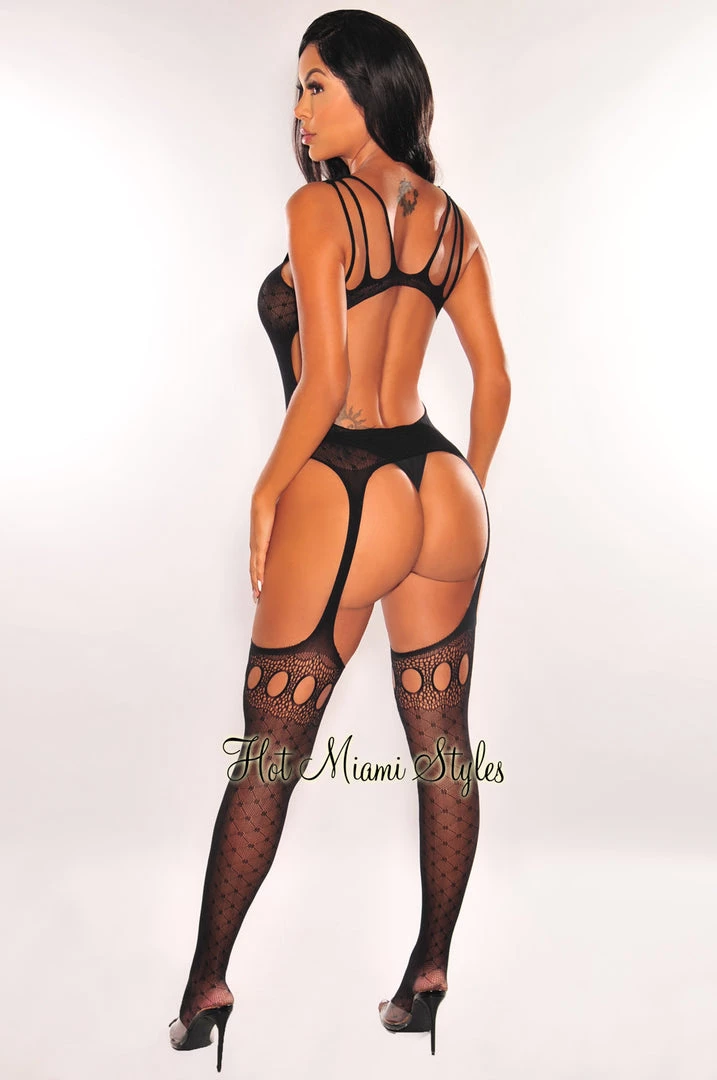 Tease your babe to the bedroom in this sexy bodystocking featuring sheer lace cups, slashed shoulder straps, a wide open netted center bodice panel, a fully open crotch and back, string garters, attached thigh high stockings with small cutouts, and an over the toe style.
