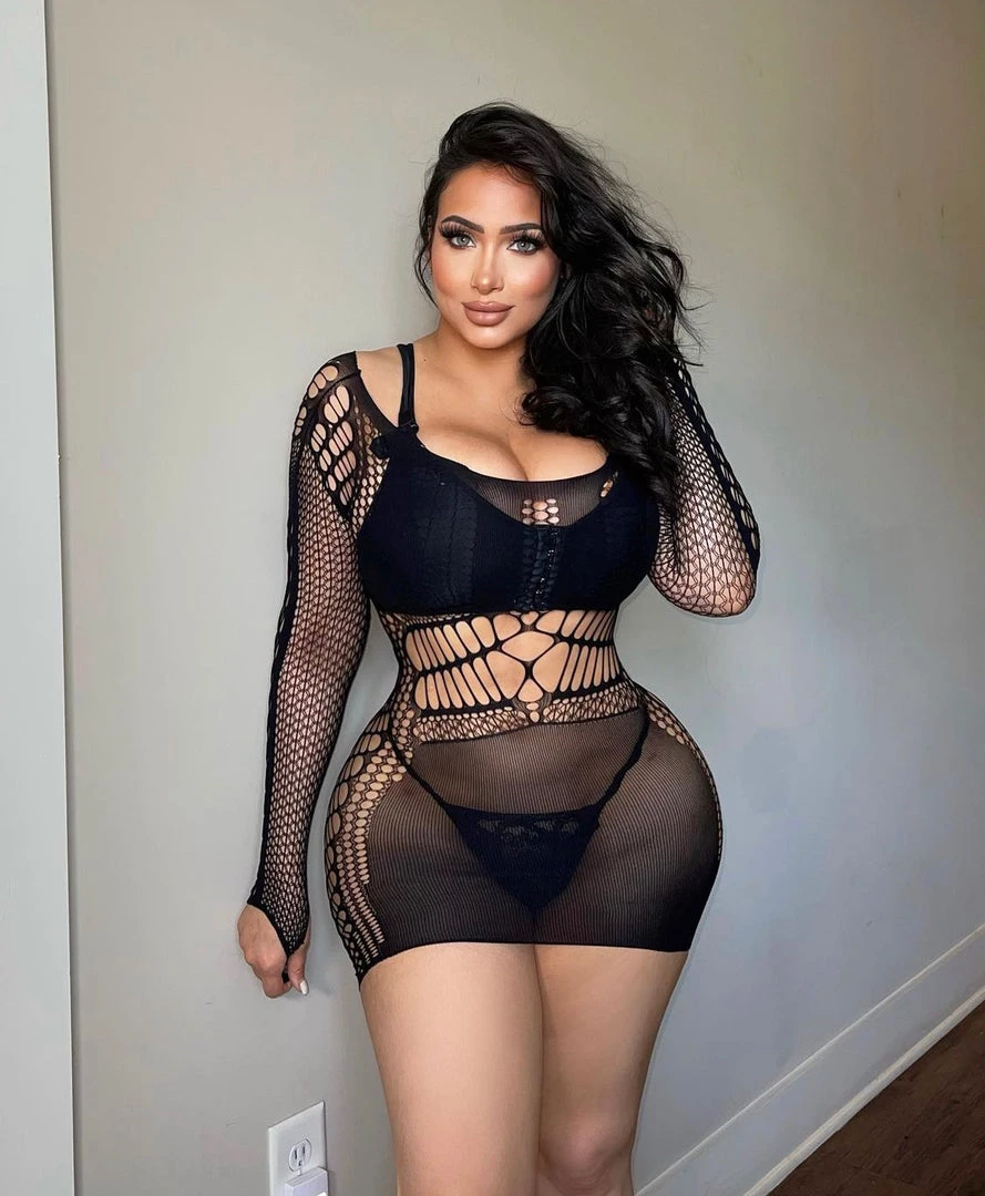 Promise your babe all the love you have to give in this gorgeous mini dress featuring sheer netted cups, a high scoop neckline, long fitted sleeves, a slashed open bodice, and a curve-accentuating skirt. Panty not included